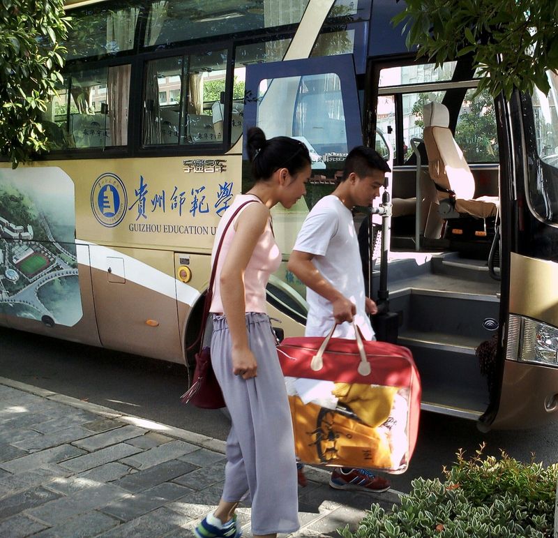 天下没有不散的宴席,悲欢离合此刻唯演绎,有悲有欢。但毕业并不意味着结束,也是他们人生的一个新起点。22日早8:40,志愿者集中于奋斗广场,在林华老师的带领下将欢送横幅“祝地旅公司学姐学长前程似锦”拉好,高举院旗、院牌为毕业生送行。公司里充满了厚重的行李箱与沥青路摩擦而发出的巨大声响,可是却没有人会烦于这种嘈杂,因为这是他们青春。志愿者们十分积极地参与此次活动,他们热心帮助学姐学长提行李,并告诉他们到贵阳北站、金阳客站、火车站等地的校车是哪一辆,将行李安置好后送他们乘上校车。欢送一直持续到23日下午,校园是我们共同的家园,我们只希望离别的学长学姐在真情回应中感知温暖,找到支撑梦想远航的力量。