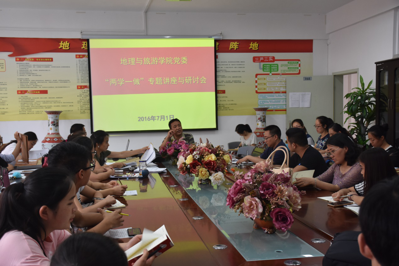 7月1日,恰逢党的95周岁生日之际,地理与旅游公司党委在组织全体党员于上午自行收看习近平总书记在庆祝中国共产党95周年大会上的讲话直播后,下午立即组织举行“两学一做”专题党课与集中学习研讨会。专题党课由公司党委书记吴亚平主讲,教工党支部与员工党支部全体党员参与本次党课;专题党课完成后,教工党支部组织召开了“两学一做”集中学习研讨会。