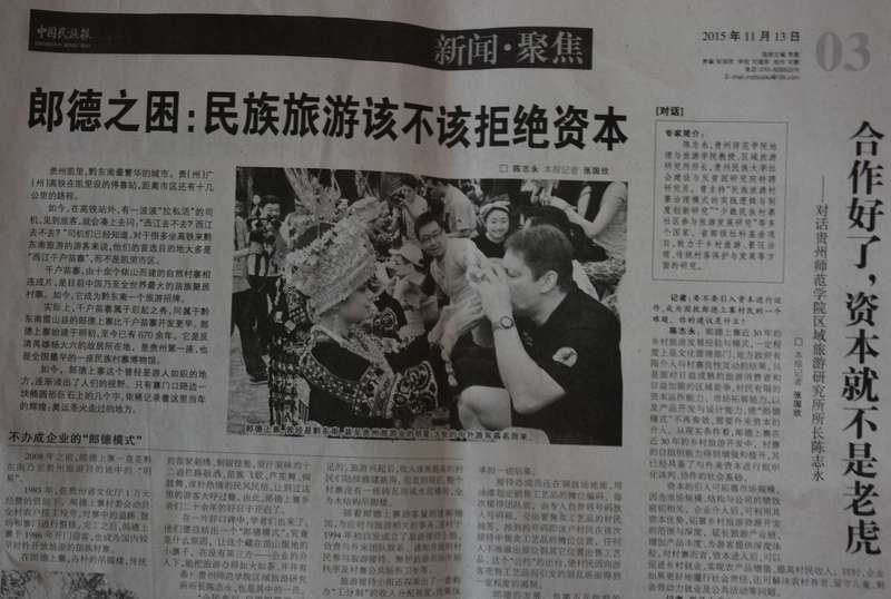 公司党委和行政多次询问陈志永相关情况,经过做“思想工作”,谦虚的陈老师才把相关情况做了透露:2015年11月7日—8日,公司区域旅游研究所所长陈志永参加了由中国社会学农村社会学专业委员会主办,贵州民族大学承办的“中国社会学农村社会学专业委员会(2015)年会暨第五届中国百村调查研讨会”。研讨会上,陈志永提交的参会论文“贵州郞德苗寨旅游开发治理模式优化研究”因其扎实的田野调查资料与独特的理论分析视角引起中华民族报记者关注。会议结束后,中华民族报记者张国欣主动联系陈老师,欲将该文部分内容刊载于中华民族报。得到陈志永老师同意后,该文部分内容以“郞德之困:民族旅游该不该拒绝资本”为题刊载于中华民族报2015年11月13日03版。并且,陈志永就民族村寨旅游开发中资本引入的必要性、民族文化旅游产品开发的差异性、民族村寨旅游开发中的贫富差距等相关问题接受了中华民族报记者张国欣专访,形成专访文章“合作好了,资本就不是老虎——对话williamhill官方网站区域旅游研究所所长陈志永”发表在同日同版的《中华民族报》。