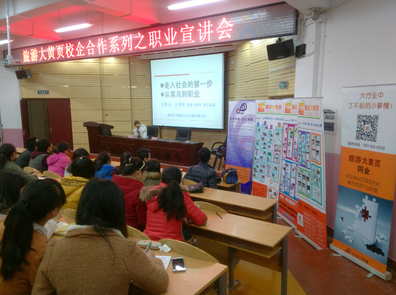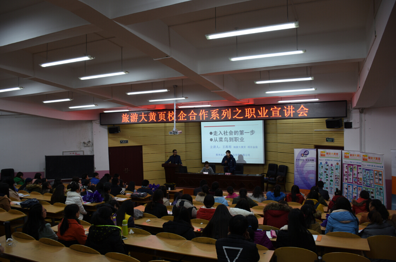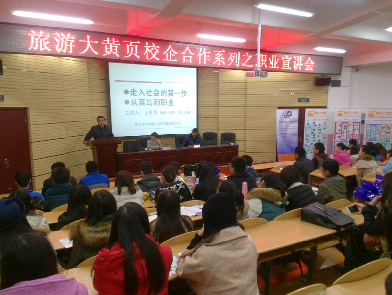 2015年12月15日晚7点至8点半,公司旅游管理专业实践基地贵州水木同创文化传媒有限公司的“旅游大黄页”项目总监王再利在公司宁静楼152教室举办了一场针对旅游管理专业员工的旅行社职业宣讲会。宣讲会由公司地理与旅游公司旅游实训室主任周杰副教授主持,出席宣讲会的还有贵州水木同创文化传媒有限公司副总杨巍以及公司地理与旅游公司党委副书记吴亚平。