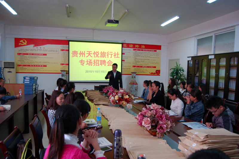 2015年10月15日上午9点至11点以及下午2点至4点,公司携手贵州旅游企业界新星——贵州天悦旅行社分别在宁静楼236教室、地理与旅游公司会议室举办了两场针对2016届旅游管理本科应届毕业生的专场招聘会。