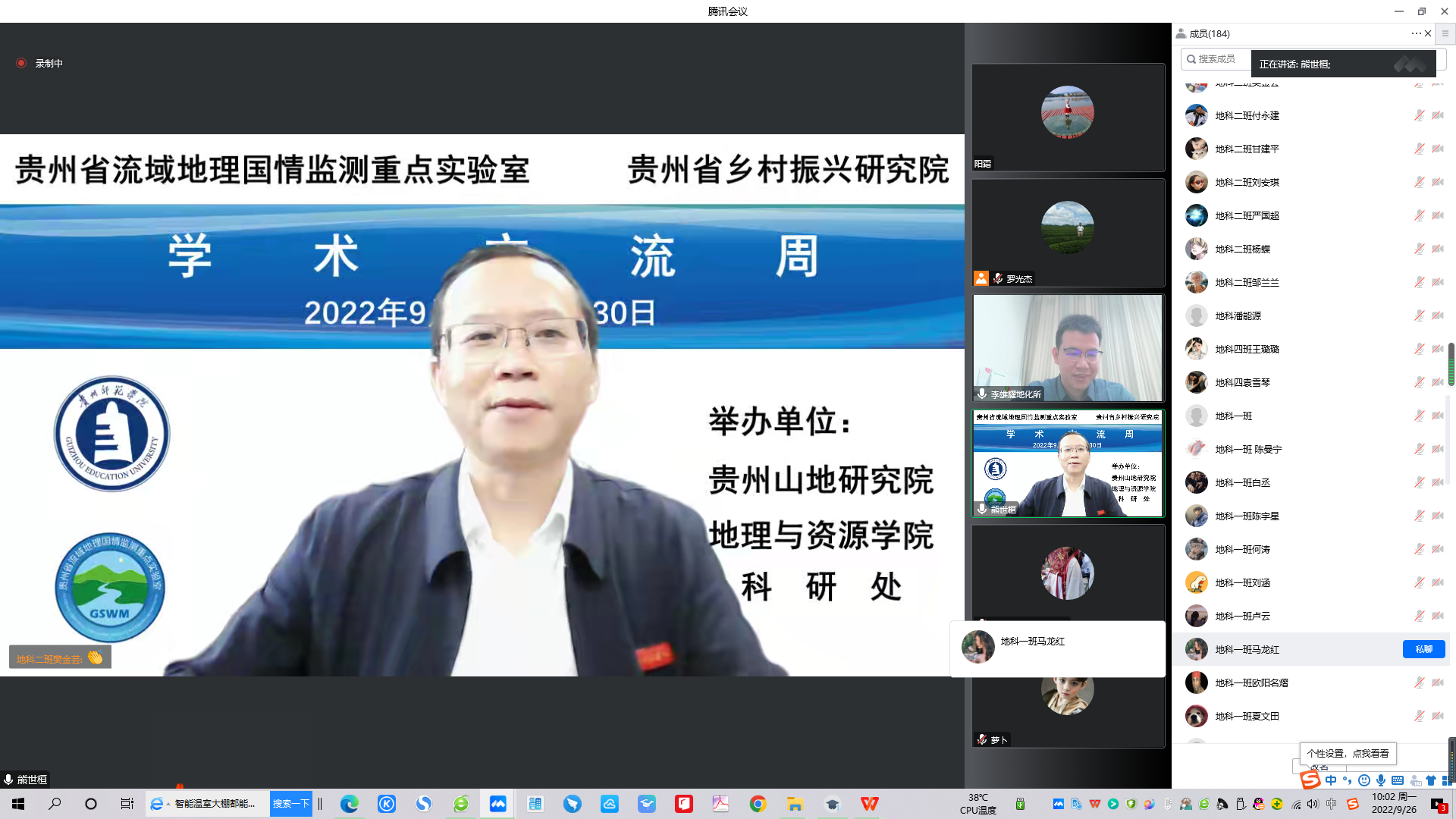 为加强学术交流,营造良好学术氛围,拓展学术领域,推动学科平台高质量发展,2022年9月26日--30日,公司贵州山地研究院、williamhill官方网站、科研处联合举办地理与资源类学科2022年下半年学术交流周。受当前疫情影响,交流周活动在腾讯会议进行,公司党委副书记熊世桓主持了专家学者学术报告,地理与资源类相关专业教师、研究生、本科生参加了学术交流周全部特邀报告。