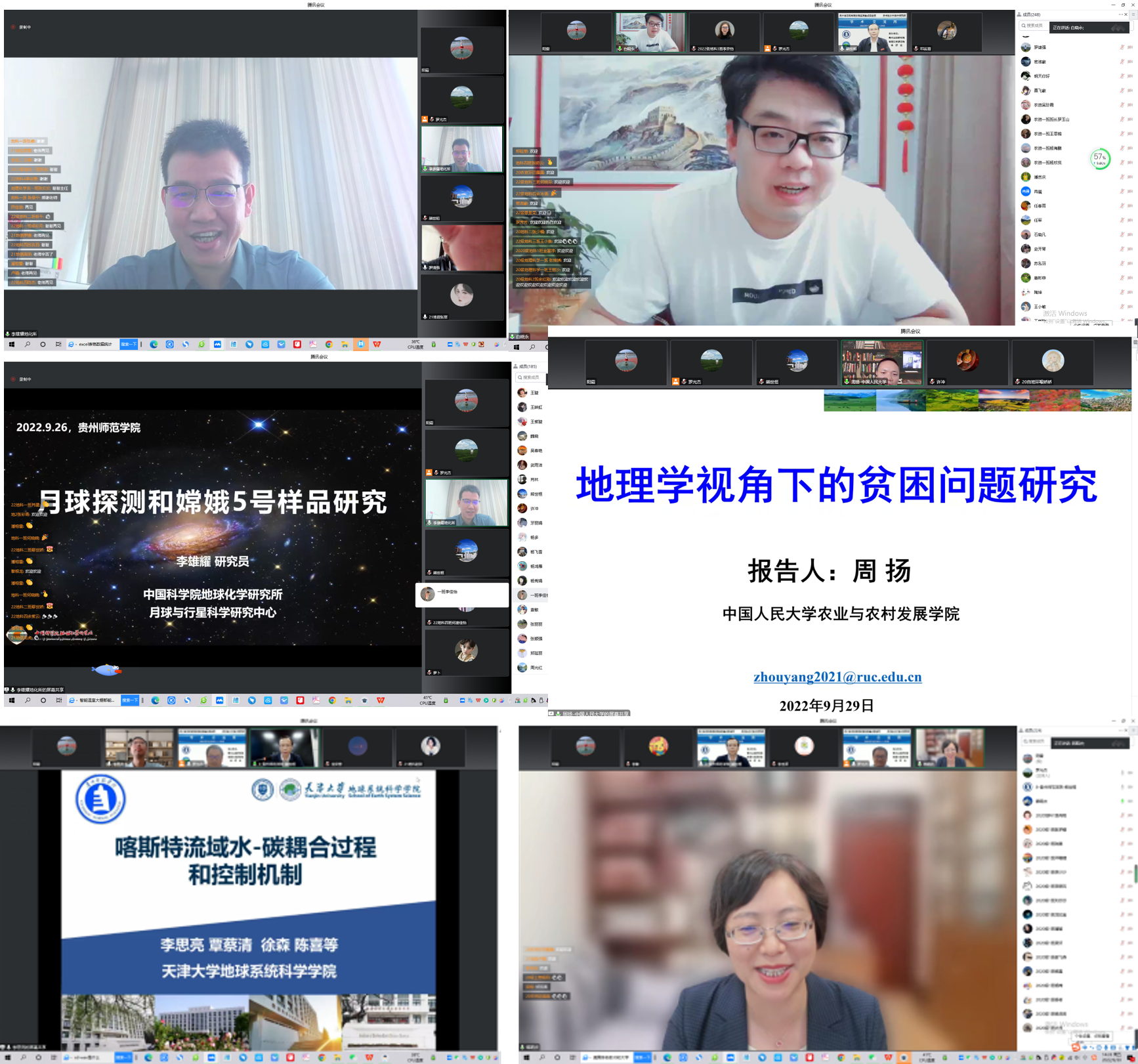 本次交流周共邀请来自中国科公司、复旦大学、中国人民大学等科研院所和高校专家学者进行了6场专题学术报告。中国科公司地球化学研究所研究员,博士研究生导师,月球与行星科学研究中心主任李雄耀作了题为《月球探测和嫦娥五号样品研究》的专题报告;中国科公司地球化学研究所研究员,博士研究生导师,生态环境与资源利用中心主任白晓永作了题为《喀斯特生态安全与贵州碳中和能力诊断》的专题报告;美国NASA研究科学家,公司特聘教授李爽作了题为《地球科学大数据高性能计算的现状与展望》的专题报告;中国人民大学副教授,博士生导师周扬作了题为《地理学视角下的贫困问题研究》的专题报告;国家杰出青年科学基金和优秀青年科学基金项目获得者,天津大学教授,博士研究生导师李思亮作了题为《喀斯特流域水-碳耦合过程和控制机制》的专题报告;复旦大学历史地理研究所教授,博士研究生导师韩昭庆作了题为《历史时期玉米种植与贵州石漠化变迁的关系》的专题报告。