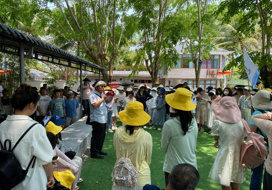 在实地考察环节,第一天,团队首先到达海南的文化窗口即海南省博物馆,体验海南丰富历史文化遗产。然后到红色娘子军纪念馆让员工直观了解革命先辈的英勇事迹。在这里,吴亚平书记给同学们上了思政第一科,为员工讲述娘子军历史,弘扬女性力量及革命的顽强、无畏的精神,让员工深刻感受红色文化;接着来到著名天然港湾石梅湾,观察其独特地貌和生态环境。第二天,探访天涯海角景区,欣赏南海的壮丽景色,感受海角天涯的浪漫氛围。这里王朋辉老师讲授了海南地质成因,廖欣荣⽼师介绍热带植物,例如⽊棉、榕树、椰树、棕榈等;去往亚龙湾,探索美丽的海底世界,感受海洋生物的魅力;来到兴隆咖啡园,品尝地道的海南咖啡了解咖啡的制作流程和背后的文化内涵;前往兴隆热带植物园,一同领略热带雨林的神奇魅力。第三天,攀登“海南第一山”东山岭,王朋辉老师和况江老师通过讲授此处的构造运动和岩⽯矿物类型鉴别,共同带领同学们探寻这座海岛的自然奇观;来到东郊椰林,感受椰林的浓荫和海岛的宁静,共同学习椰林知识,了解椰子的生长环境、用途。第四天,来到东寨港红树林景区,一个观察和学习生态环境的绝佳场所。廖欣荣⽼师通过讲授红树林形成及其意义,李松老师通过介绍遥感温湿度和能耗对应关系,共同带领员工了解红树林的生长环境、生态功能以及保护意义。来到雷琼世界地质公园,在这里王朋辉老师详细讲授火山公园的主要岩石的各种形态特征及成因,并带领员工感受火山地貌的壮观景象。