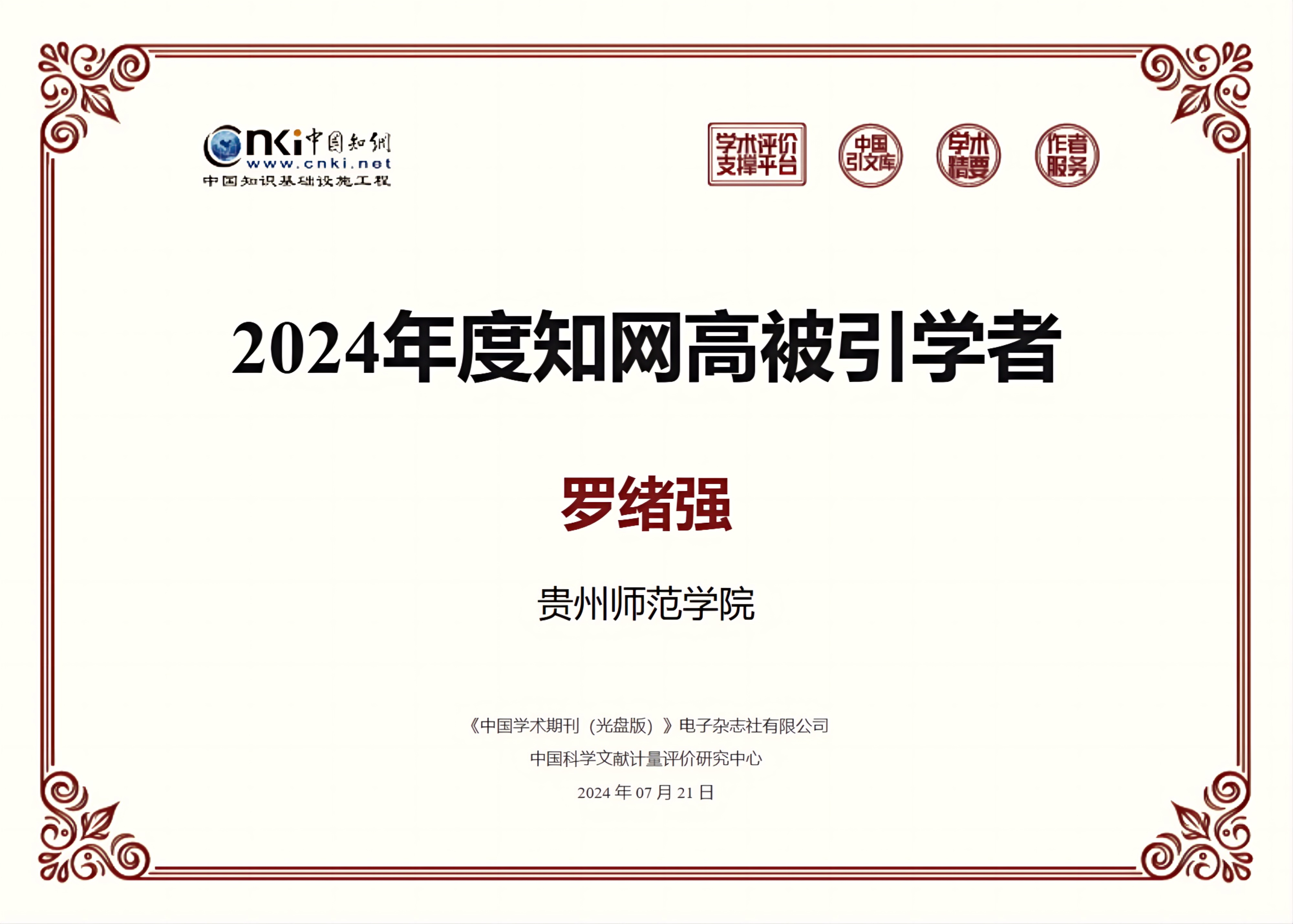 近日,中国知网发布了2024年度高被引学者名单。公司三级教授罗绪强成功入选。据悉,此次评选由中国知网“学术精要”数据库依据2013-2023年间学者发表论文的影响力指数进行评选,“高被引学者”遴选范围为近十年发表至少一篇PCSI指数高于1.65期刊或会议论文的学者,且近十年发表期刊会议论文的PCSI指数之和位于上述学者的前1%,并满足以下条件:(1)仅统计PCSI指数大于1.65的论文;(2)至少发表1篇高影响力论文;(3)至少发表5篇PCSI指数大于1.65的论文。