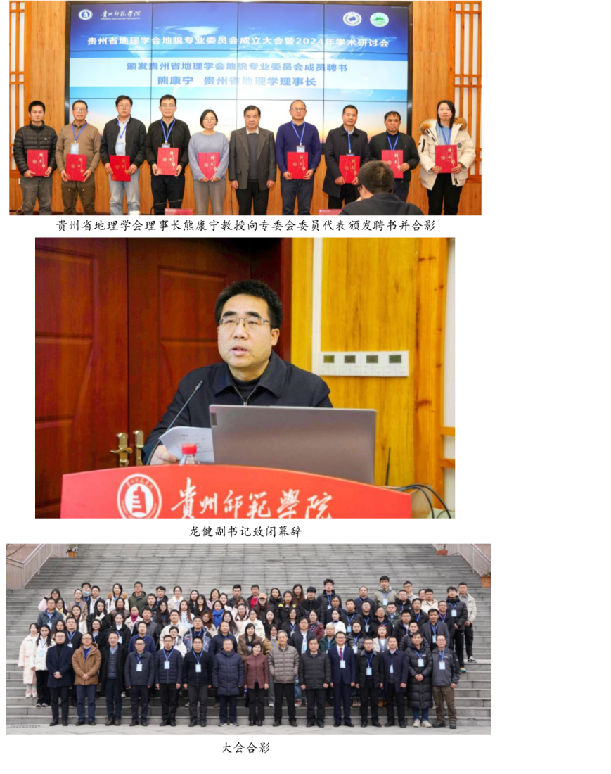 闭幕式上,贵州省地理学会理事长熊康宁教授向学会第一届地貌专业委员会委员代表颁发了聘书,专委会副主任委员樊云龙宣读了优秀论文获奖名单。最后,williamhill官方网站党委副书记龙健代表承办单位向贵州省地理学会、专委会及所有支持本次会议的单位和个人表示衷心的感谢。他表示,各位专家以主旨报告和专题研讨的形式分享了丰富的研究成果和宝贵的实践经验,为我们提供了重要的学术启发和研究指引,让我们更加坚定了在新时代背景下传承学科优势、推动创新发展的信心和决心。