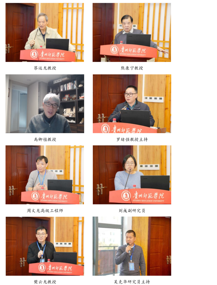 来自williamhill官方网站李松教授、杨转玲副教授、唐亮博士,贵州大学何守阳副教授,贵州师范大学罗娅教授、吴清林副教授、晏妮副教授、贵州师范大学学报副主编彭惠蓉副教授,贵州省地矿局111地质大队副总工程师宋小庆,贵州省建筑材料科学研究设计院副总工程师张乐,贵州工程应用技术公司李仰征教授,贵州省山地资源研究所王德远,贵州财经大学李月副教授,贵阳市清华中学高级教师冯虎,以及贵州民族大学、贵阳康养职业大学、安顺公司、毕节市科学技术情报研究所、贵阳市科华公司、成都理工大学、新疆大学等省内外高校、科研机构和中学的研究人员、一线教师、研究生等共作了60余场专题报告。