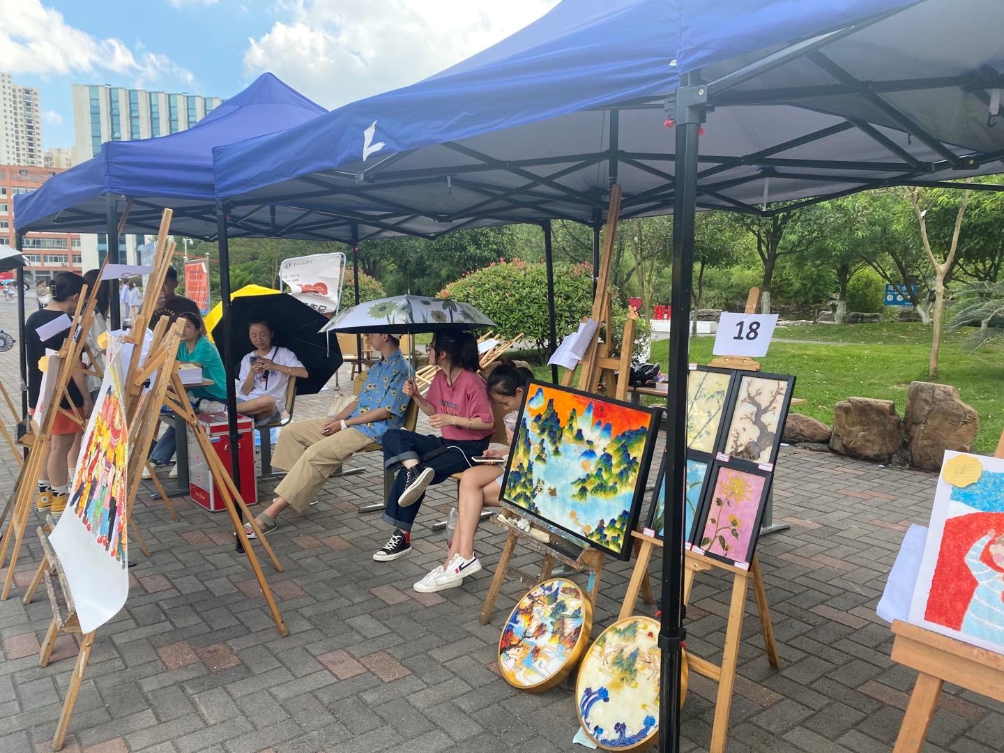 活动现场,同学们创作的有关党史的作品整齐有序的摆放在鉴湖旁。剪纸、手工、绘画的国旗、党徽、党旗和天安门等都抒发了同学们对党的热爱之情。炎炎夏日,同学们在志愿者的讲解和引导下津津有味的欣赏着,并为喜欢的作品投出宝贵的一票。在一天的展览下,获奖的作品已然决出,名单将会后续整理后公布。