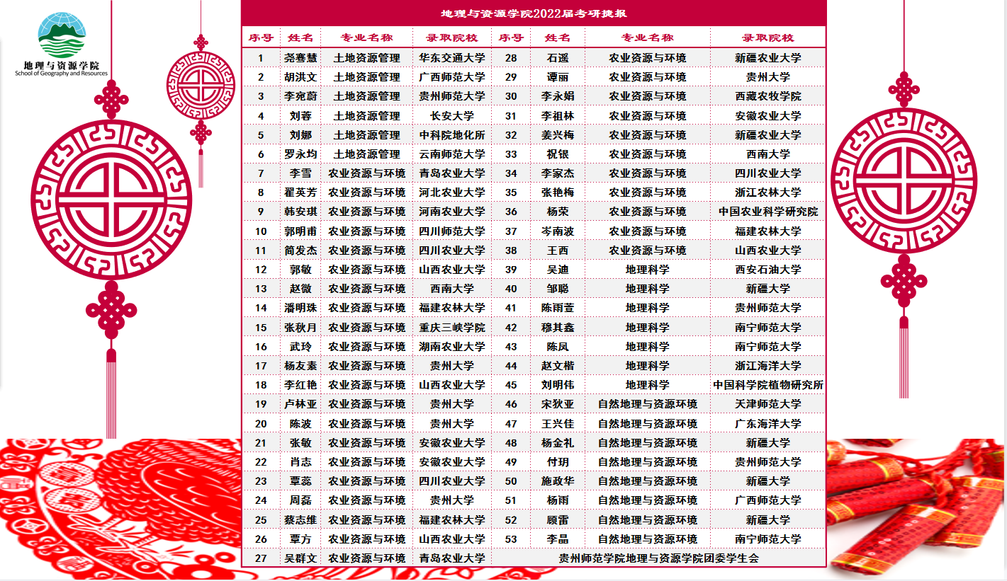 “幸福是奋斗出来的”,习近平总书记的这句话平实质朴,饱含情怀,催人奋进,激荡光荣与梦想,一直点燃着地资师生在新时代奋发向前的激情。还记得去年,公司召开2021届考研总结表彰暨2022届考研动员大会,在火热的氛围中地资人宣誓的场景历历在目,一年时间转瞬即逝。在选择了奋斗之后,全体师生的艰辛换来了新的收获,换来了更大的成绩,获得了地资人又一次的幸福与骄傲!尤其值得一提的是,考研的“明星”专业——农业与资源环境,在69人中考研拟录取32人,考研升学率高达46.38%;一个宿舍考上4人的“考研明星宿舍”,是同学间长久的鼓励和陪伴;初出茅庐的考研“新秀专业”也出来了,自然地理与资源环境专业今年崭露头角,考上8人,为做好明年的考研工作开了好头。
